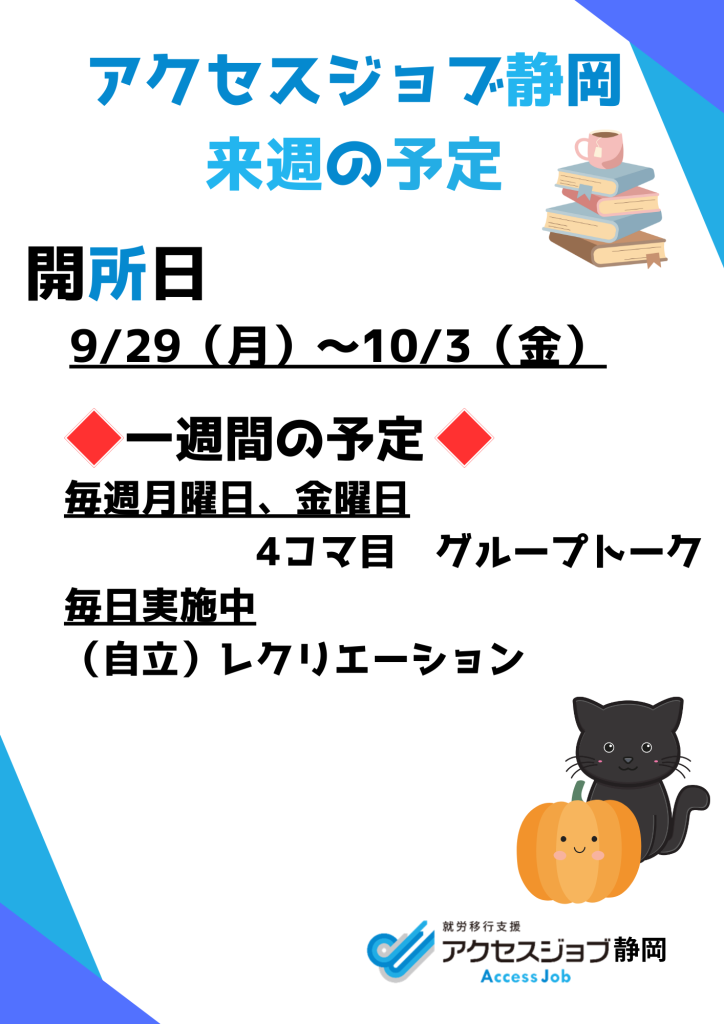 【アクセスジョブ静岡】来週の予定(9/29~10/3)