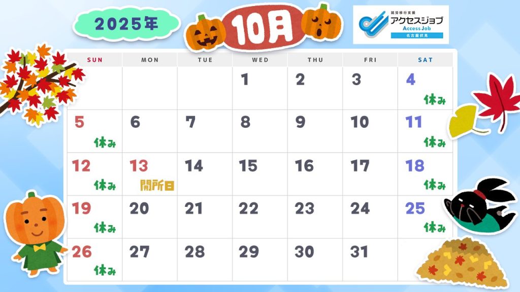 アクセスジョブ名古屋伏見の10月の開所日のお知らせです。