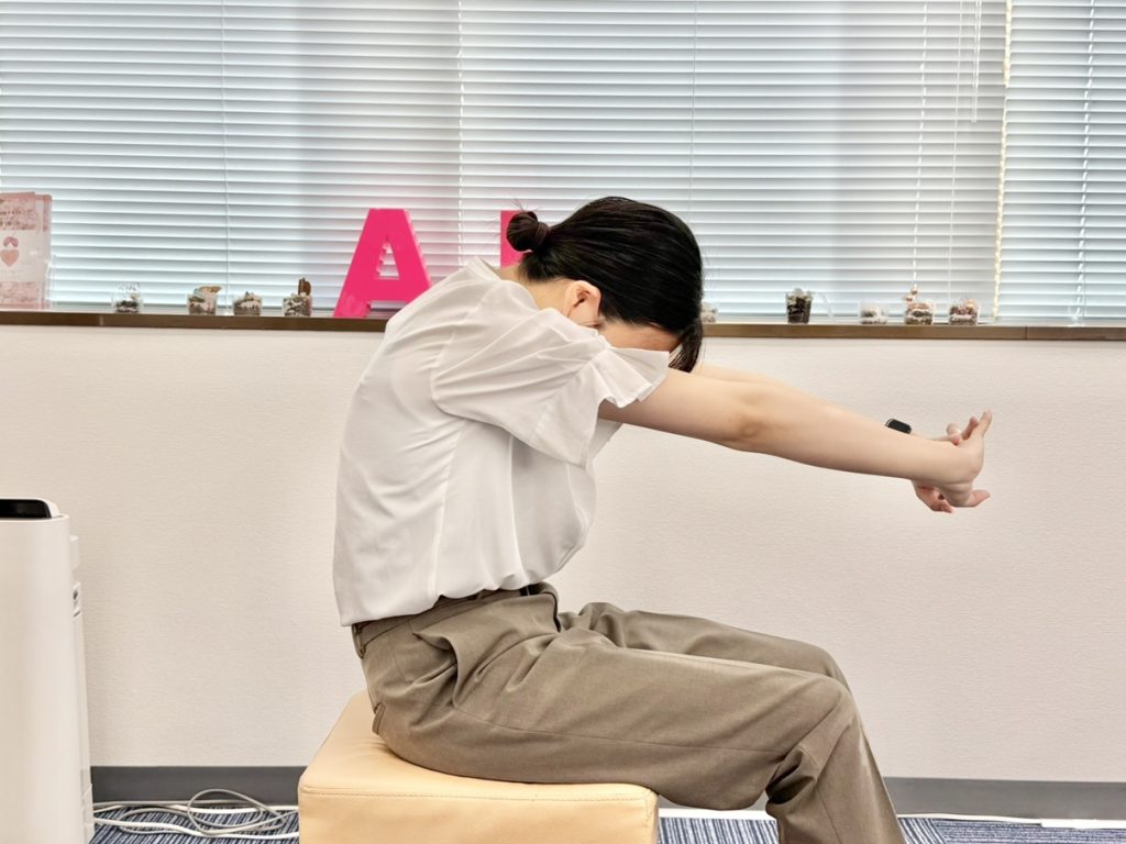 1. 椅子に座ったまま両手を前で組み、息を吐きながら背中を丸めます。