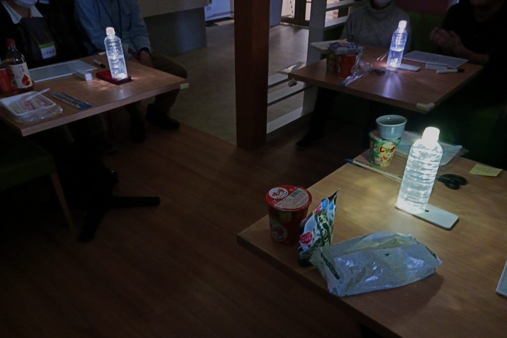 電気を消して、スマホとペットボトルを組み合わせた即席ランタンの光を使います。