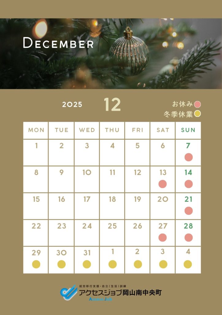 就労移行支援事業所のアクセスジョブ > ブログ > 12月開所カレンダー|就労移行支援事業所アクセスジョブ岡山南中央町