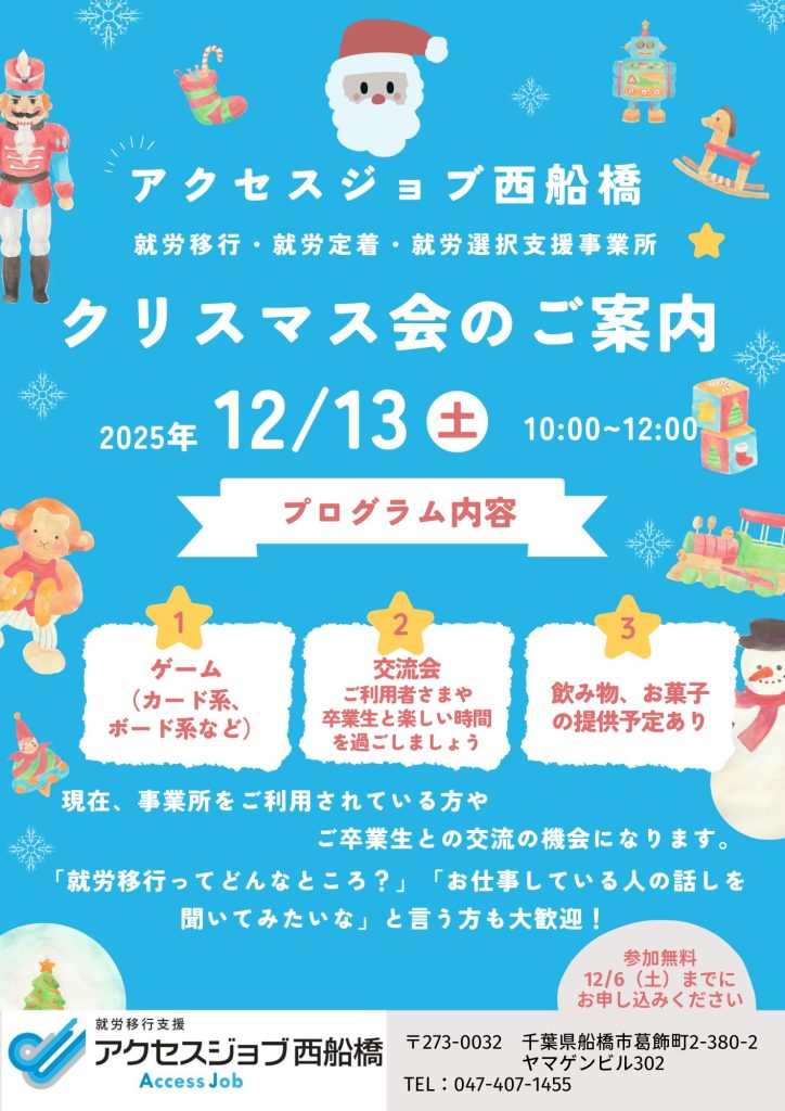 就労移行支援事業所のアクセスジョブ > ブログ > 2025年 クリスマス会を開催!12月を楽しんで行こう【就労移行支援事業所 イベント】