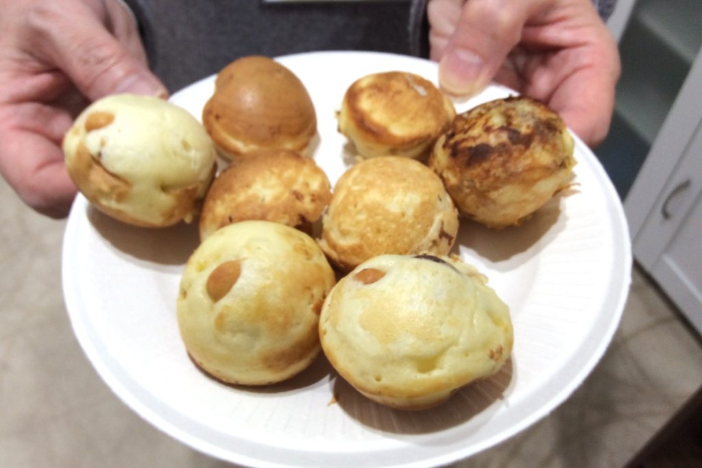 後半は男性ふたりが焼きを担当。ひっくり返しながら語り合う熱い男子会…!