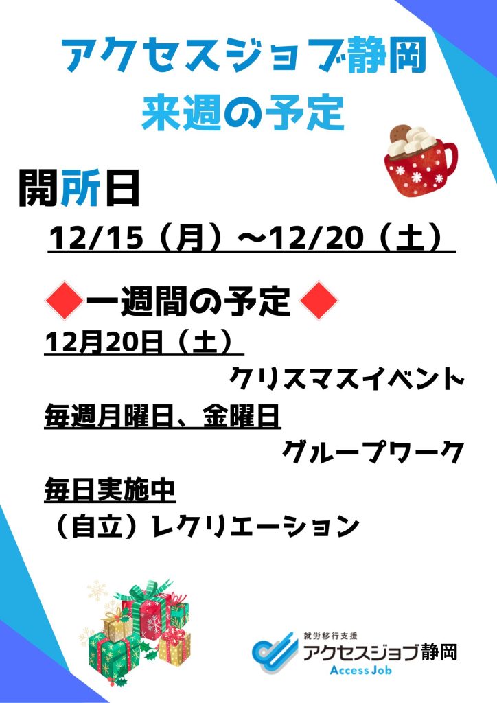 【アクセスジョブ静岡】来週の予定(12/15~12/20)