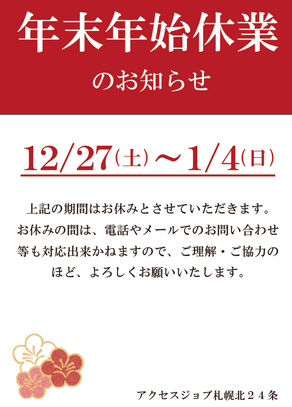 就労移行支援事業所のアクセスジョブ > ブログ > 年末年始休業日のお知らせ