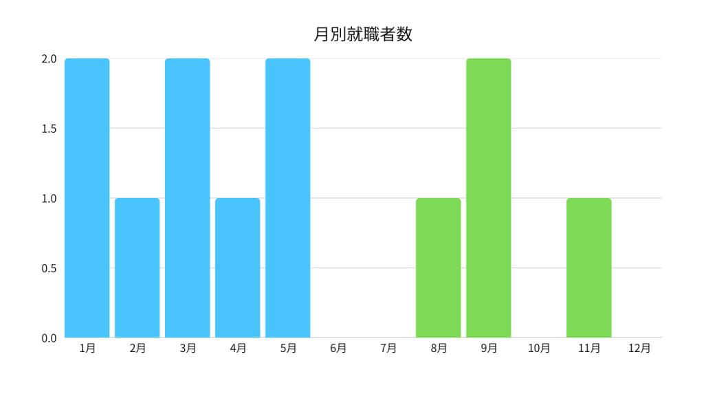 これは毎年2月の就職相談会や、4月からの働き初めに向けて就職活動をされる方が多いことから、結果として4~6月に就職をされる方が多いということになります。