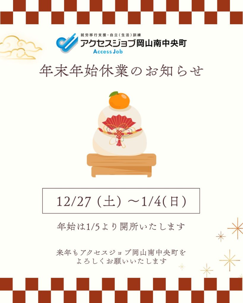 12月27日(土)から1月4日(日)の期間、お休みさせていただきます。