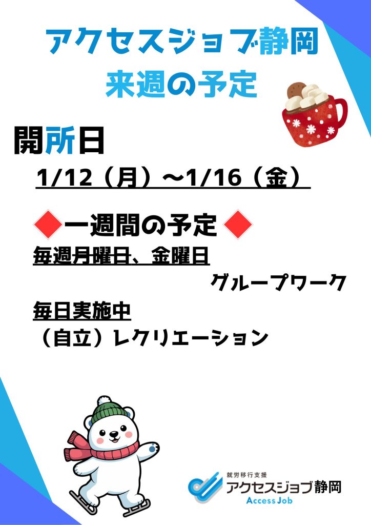 就労移行支援事業所のアクセスジョブ > ブログ > 【アクセスジョブ静岡】来週の予定(1/12~1/16)
