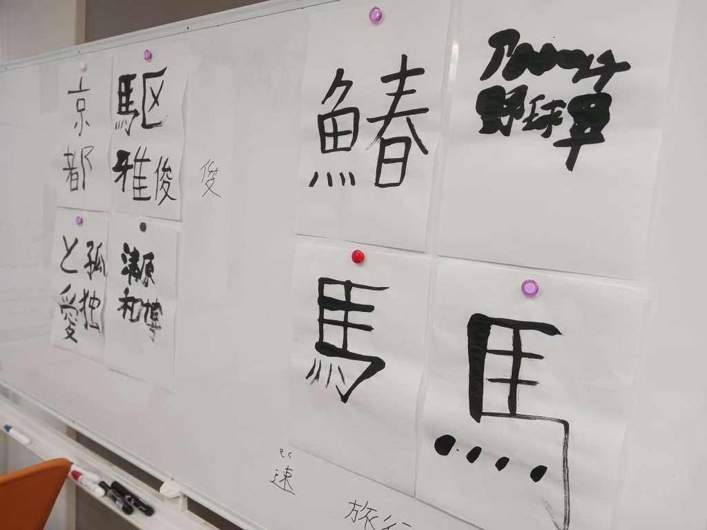 みなさん思い思いの漢字や言葉を選んで、上手に筆を走らせていました。個性が光る作品が出来上がりました!