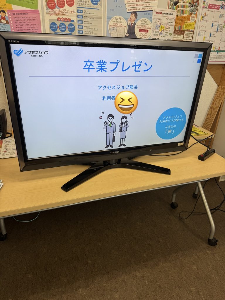 今回は、その外部セミナーをきっかけに就労移行支援事業所アクセスジョブ熊谷を利用し、就職された方にご協力いただき、ご本人による卒業プレゼンしていただきました。