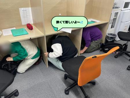 🔷机の下に入り、頭や首を守る姿勢を取る