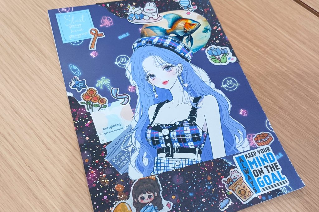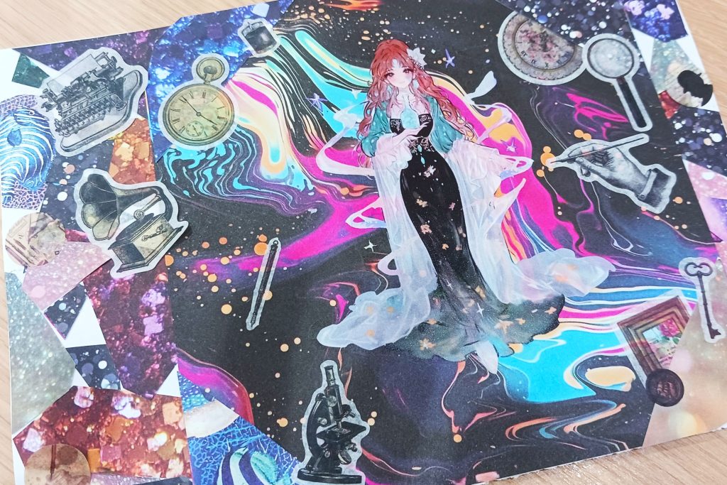 利用者Kさんの作品、宇宙がテーマです。紙を細かく切ってあったり、無機物のステッカーと合わせることで、宇宙の壮大で不思議な感じが表現されています!