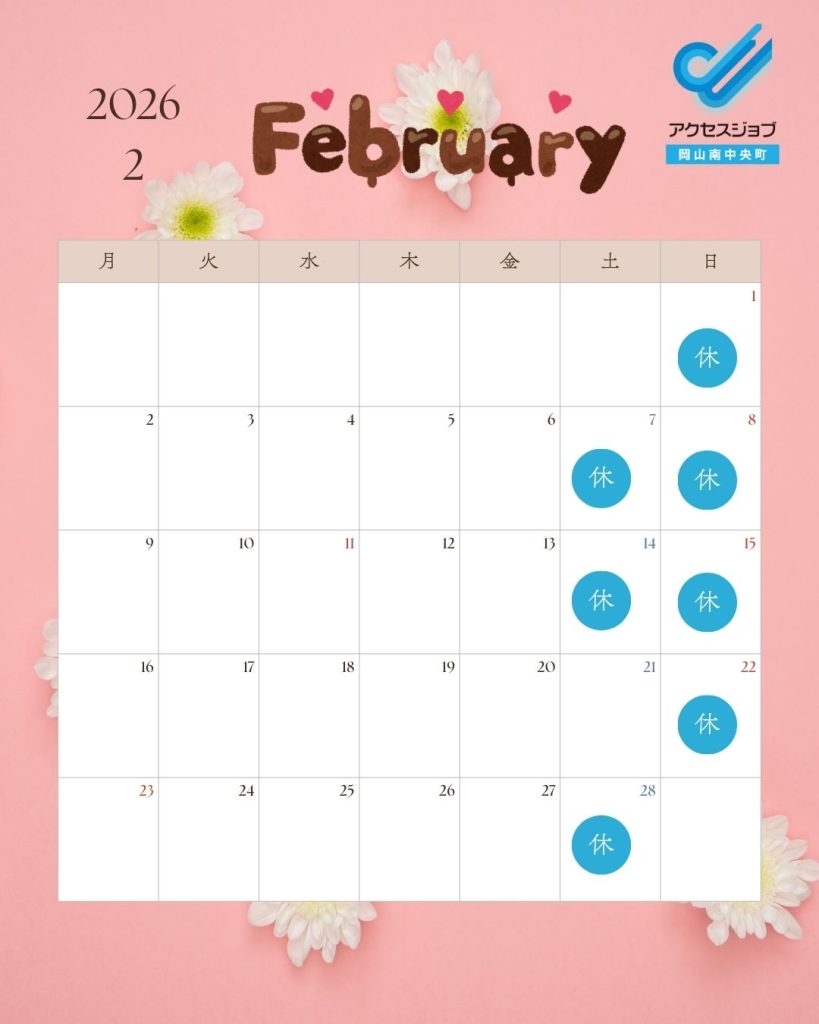 2月開所カレンダー|就労移行支援事業所アクセスジョブ岡山南中央町
