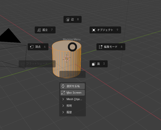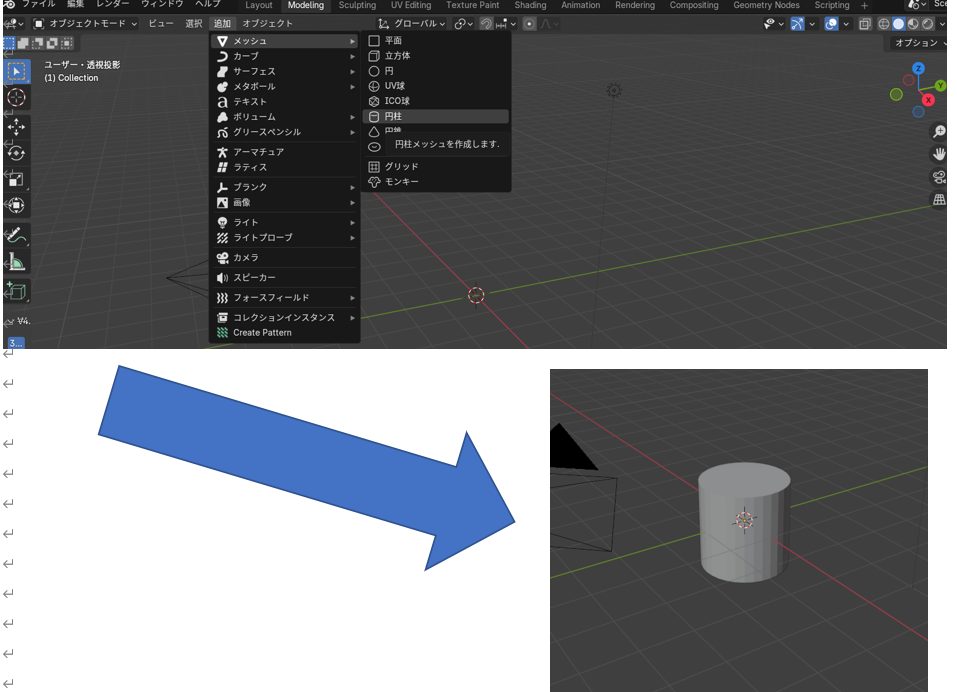 2.追加→メッシュから「円柱」を選択して、呼び出します。