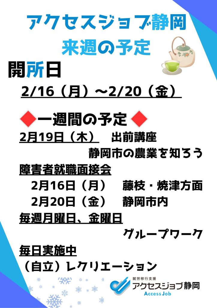 【アクセスジョブ静岡】来週の予定(2/16~2/20)