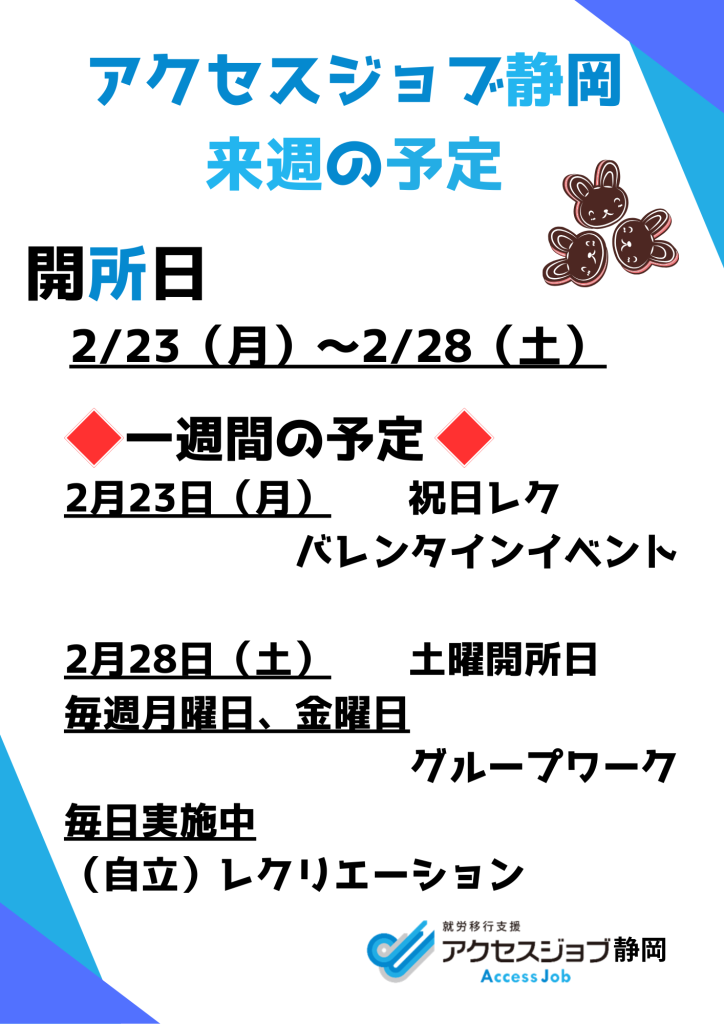 就労移行支援事業所のアクセスジョブ > ブログ > 【アクセスジョブ静岡】来週の予定(2/23~2/28)