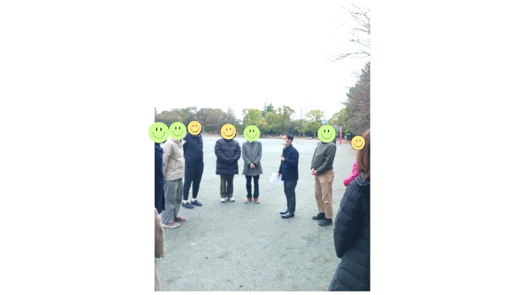 避難場所の木場公園多目的広場に到着後、点呼を取り、安否確認を行いました。