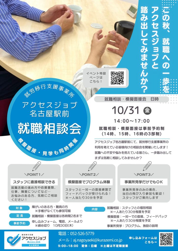 スタッフとの就職相談に加え、プログラム体験として「模擬面接会」、アクセスジョブ名古屋駅前の見学やプログラム説明も聞くことができる「事業所見学会」も同時開催予定。