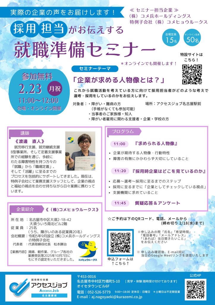 アクセスジョブ会場は定員15名、オンラインは定員50名 を予定しております。