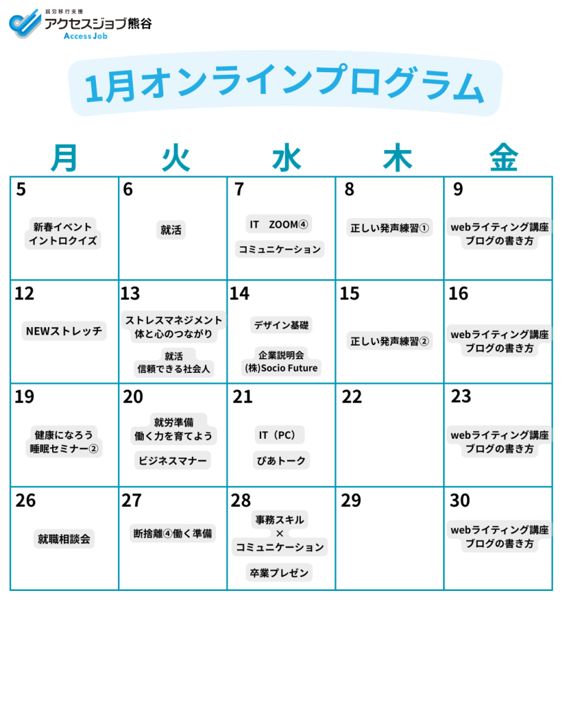 1月オンラインプログラム案内|就労移行支援事業所アクセスジョブ熊谷
