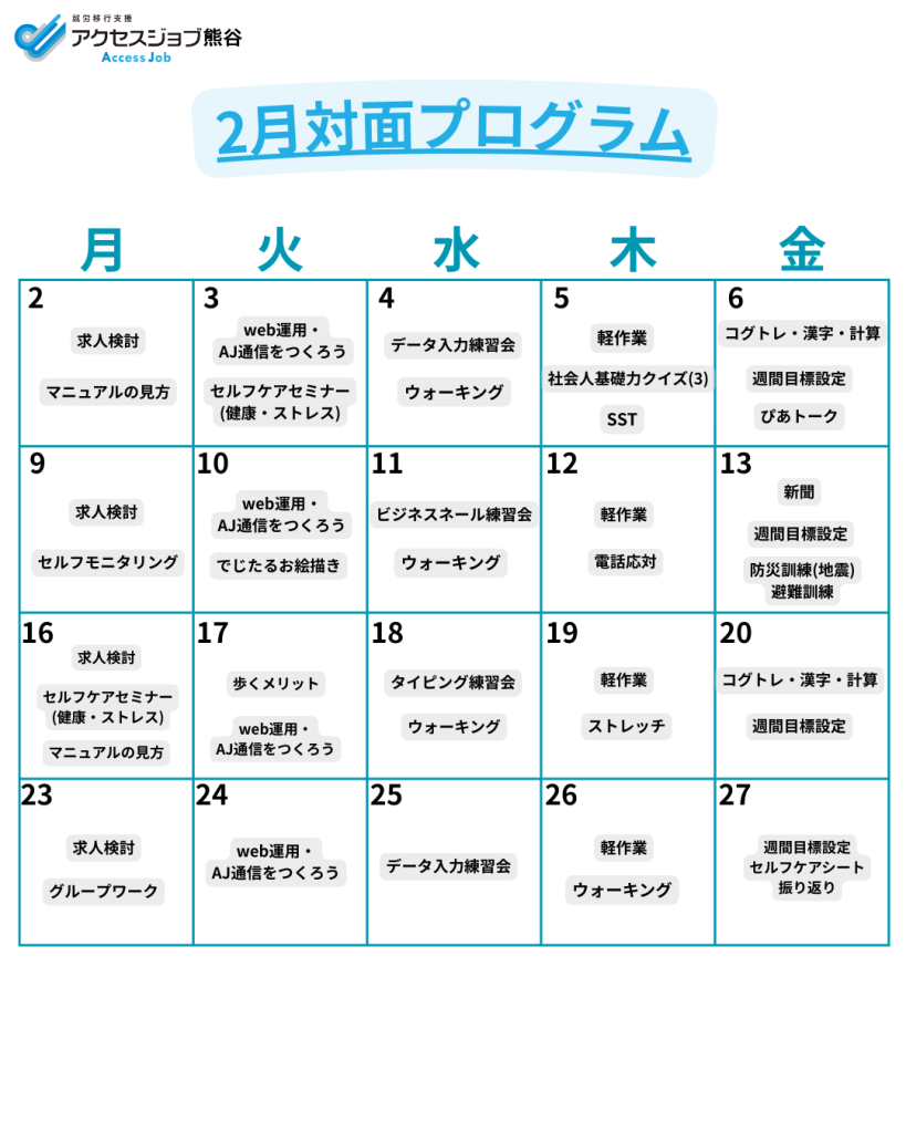 2月対面プログラム案内|就労移行支援事業所アクセスジョブ熊谷