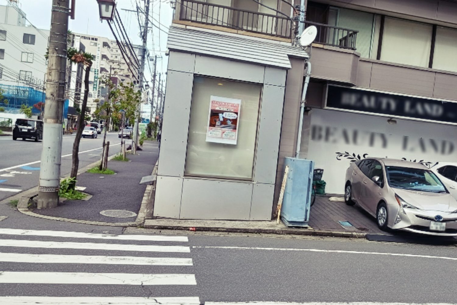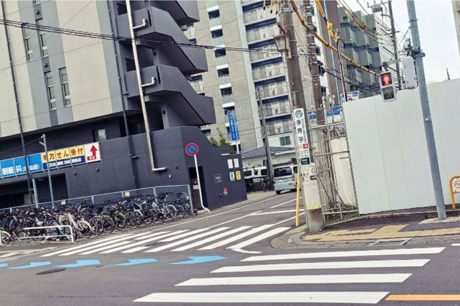 横断歩道が見えたら、角の建物を右側に沿って歩きます