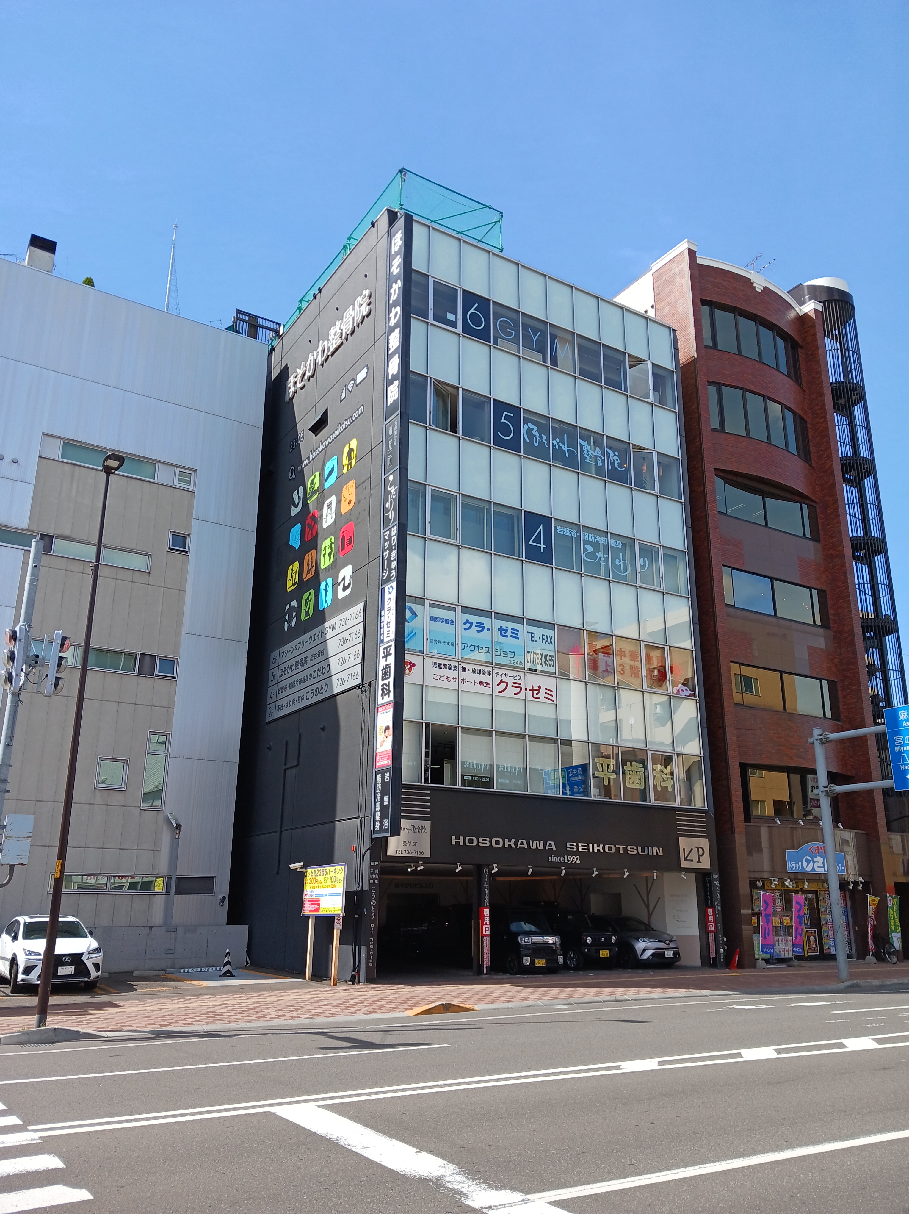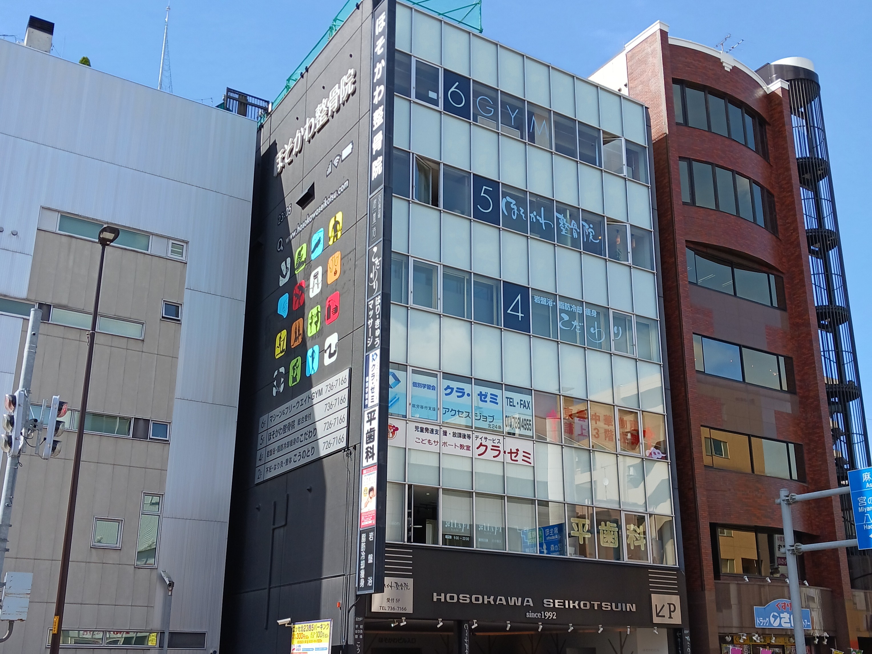 「ほそかわビル」という黒いビルの中にアクセスジョブがあります。ビルの外観には「ほそかわビル」「ほそかわ整骨院」と大きく書いてあります。