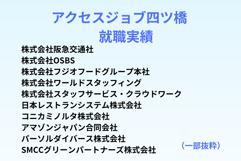 アマゾンジャパン合同会社 ・パーソルダイバース株式会社 ・コニカミノルタ株式会社 ・日本レストランシステム株式会社 ・NX・NPロジスティックス株式会社 ・株式会社OSBS ・株式会社阪急交通社 ・株式会社ワールドスタッフィング ・株式会社フジオフードグループ本社 ・株式会社ツルミテクノロジーサービス ・株式会社スタッフサービス・クラウドワーク ・株式会社クラ・ゼミ